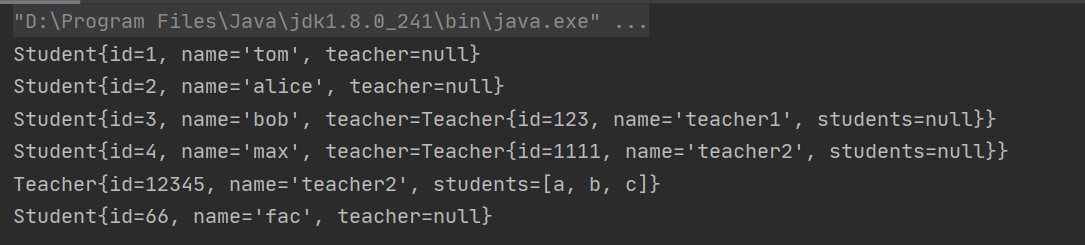@Override public String toString() { return "Student{" + "id=" + id + ", name='" + name + '\'' + ", teacher=" + teacher + '}'; } }